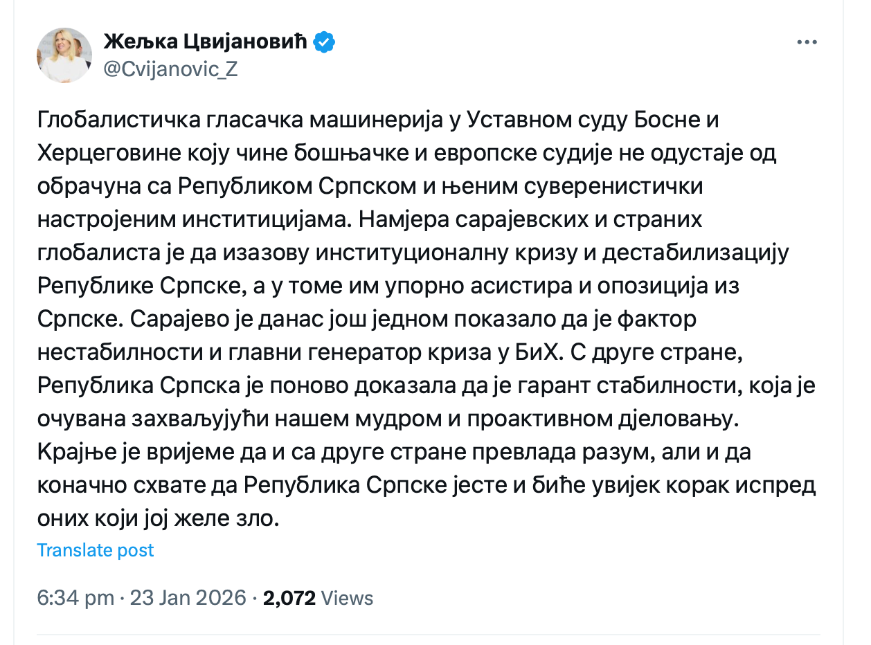 “Globalistička glasačka mašinerija u Ustavnom sudu BiH koju čine bošnjačke i evropske sudije ne odustaje od obračuna sa Republikom Srpskom i njenim suverenistički nastrojenim institicijama”, navela je Cvijanović.