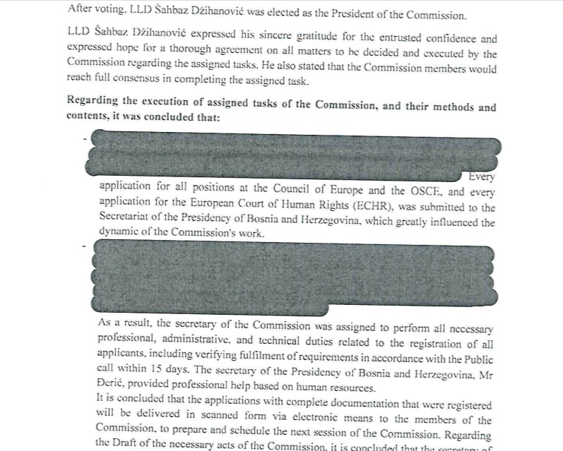 Pored imena troje odabranih kandidata za sudiju ESLJP, originalni izvještaj Komisije Predsjedništva BiH sadržavao je imena i rang-liste osoba koje su se prijavile na pozicije za druga tijela u Vijeću Evrope. Nakon što je Predsjedništvo BiH dostavilo Ministarstvu vanjskih poslova izvještaj Komisije, iz MVP su najprije zatražili da im se izvještaj dostavi u Word formatu, a potom su zatamnili veliki dio dokumenta i nakon toga ga poslali u Strazbur bez da su o tome obavijestili Predsjedništvo, odnosno Komisiju.
