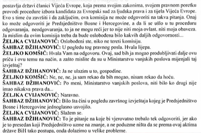 Zbog (nečije) odluke u Ministarstvu vanjskih poslova BiH da samoinicijativno prepravi izvještaj Komisije koju je imenovalo Predsjedništvo BiH za izbor kandidata za bh. sudiju Evropskog suda za ljudska prava u Strazburu, te takav “cenzurisani” izvještaj pošalje Vijeću Evrope na razmatranje, cijeli proces je sada na rubu potpune propasti. Kako je ranije objavila Istraga, Šahbaz Džihanović, bivši sudija Ustavnog suda Federacije BiH, koji je bio na čelu Komisije koju je imenovalo Predsjedništvo za izbor sudije ESLJP, obavijestio je Predsjedništvo o potezima MVP BiH koji su doveli do potpune konfuzije u Vijeću Evrope, ali i među članovima državnog Predsjedništva.