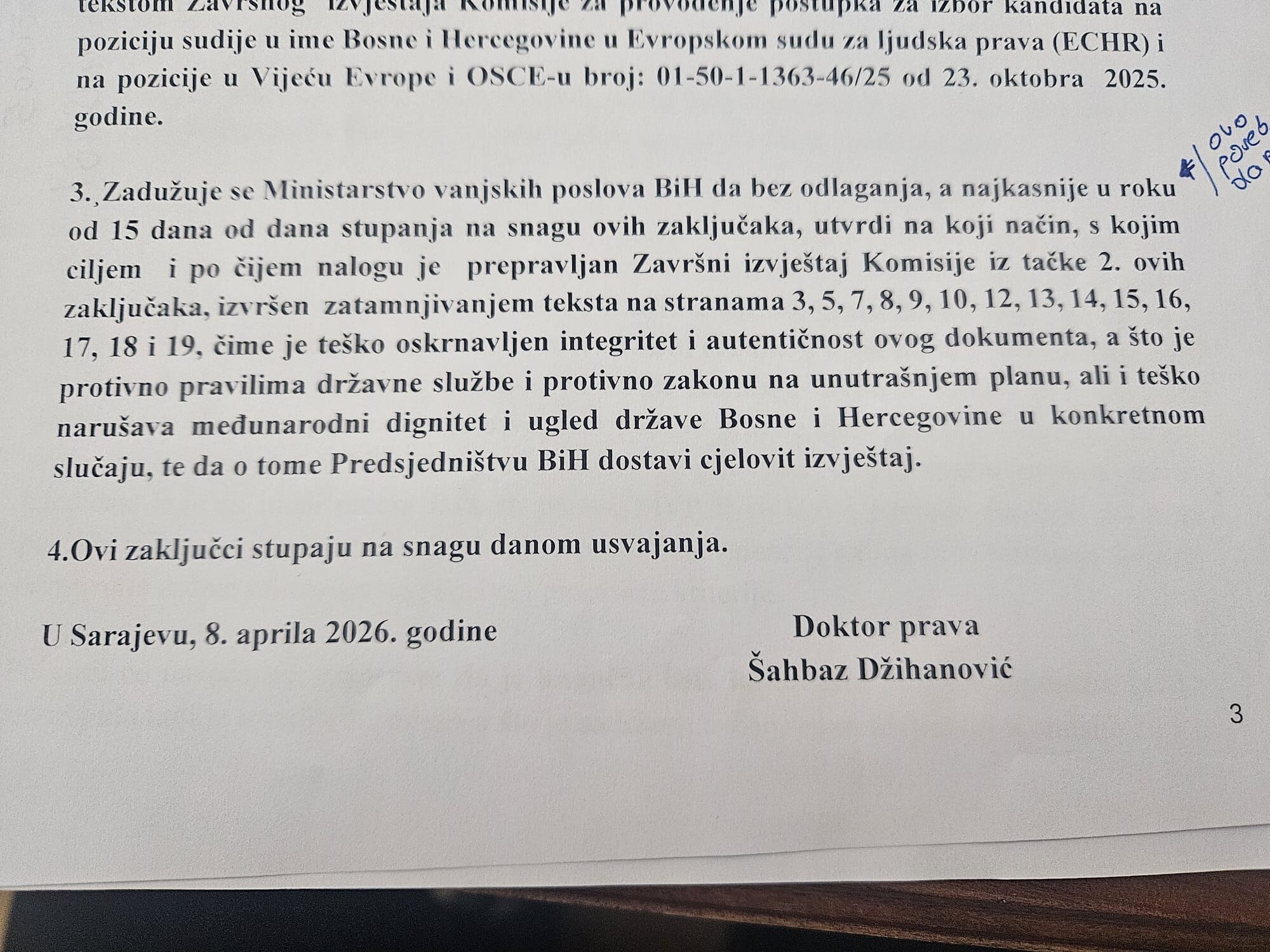 “Zadužuje se Ministarstvo vanjskih poslova BiH da bez odlaganja, a najkasnije u roku od 15 dana od dana stupanja na snagu ovih zaključaka, utvrdi na koji način, s kojim ciljem i po čijem nalogu je prepravljan Završni izvještaj Komisije iz tačke 2. ovih zaključaka, izvršen zatamnjivanjem teksta na stranama 3, 5, 7, 8, 9, 10, 12, 13, 14, 15, 16, 17, 18 i 19, čime je teško oskrnavljen integritet i autentičnost ovog dokumenta, a što je protivno pravilima državne službe i protivno zakonu na unutrašnjem planu, ali i teško narušava međunarodni dignitet i ugled države Bosne i Hercegovine u konkretnom slučaju, te da o tome Predsjedništvu BiH dostavi cjelovit izvještaj.”