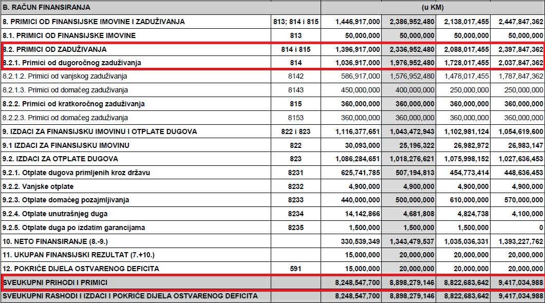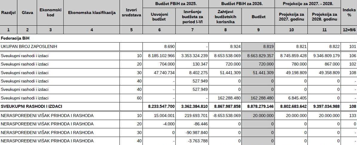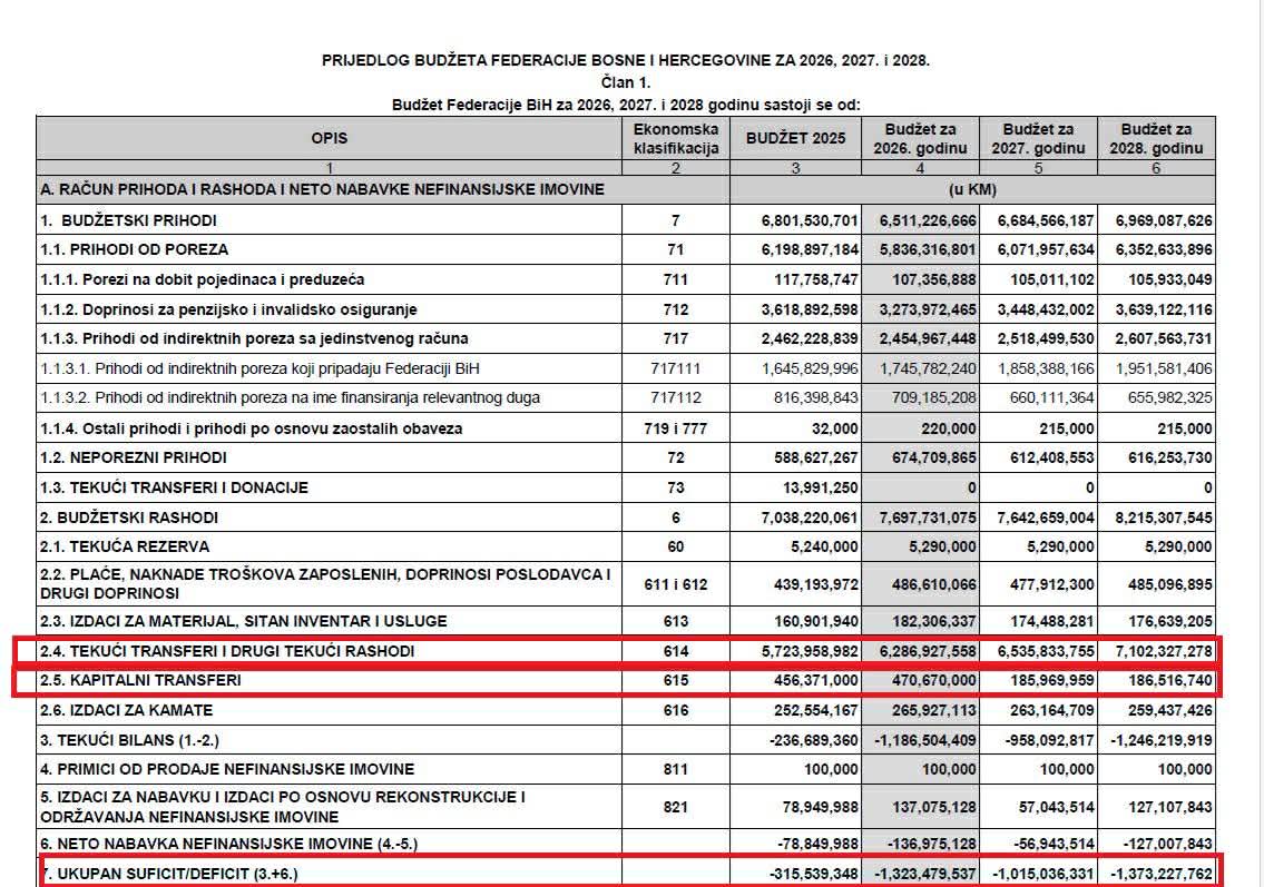 U 2026. godini planirani su ukupni prihodi/rashodi od 6,51 milijardi maraka i deficit u iznosu od 1,32 milijarde. Za 2027. godinu predviđa se okvirni budžet od 6,68 milijardi, sa deficitom od 1,02 milijarde, dok je za 2028. predviđen ukupan budžet od 6,97 milijardi KM i ukupan suficit/deficit od 1,37 milijardi maraka.