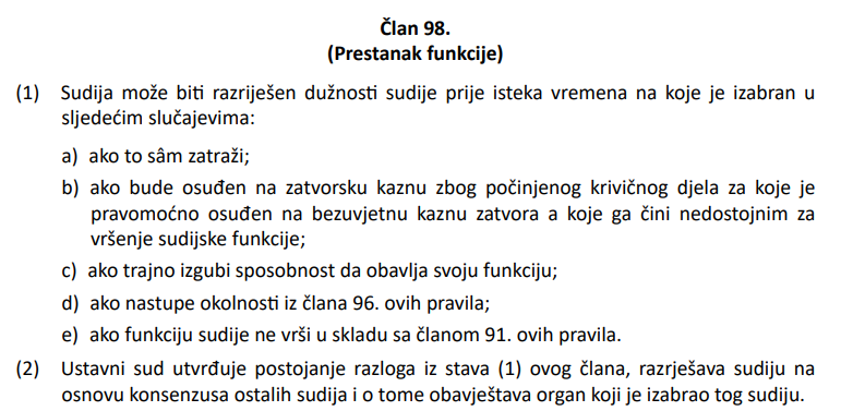 Dalje se u članu 98. stav 1. Pravila suda BiH navodi da sudija može biti razriješen dužnosti sudije prije isteka vremena na koje je izabran ukoliko to sam zatraži (a), ako bude osuđen na zatvorsku kaznu radi počinjenog krivičnog djela za koje je pravomoćno osuđen na bezuvjetnu kaznu zatvora a koje ga čini nedostojnim za vršenje sudijske funkcije (b), ako trajno izgubi sposobnost da obavlja funkciju (c), ako nastupe okolnosti iz člana 96. ovih pravila (d) i ako funkciju sudije ne vrši u skladu sa članom 91. ovih pravila (e).