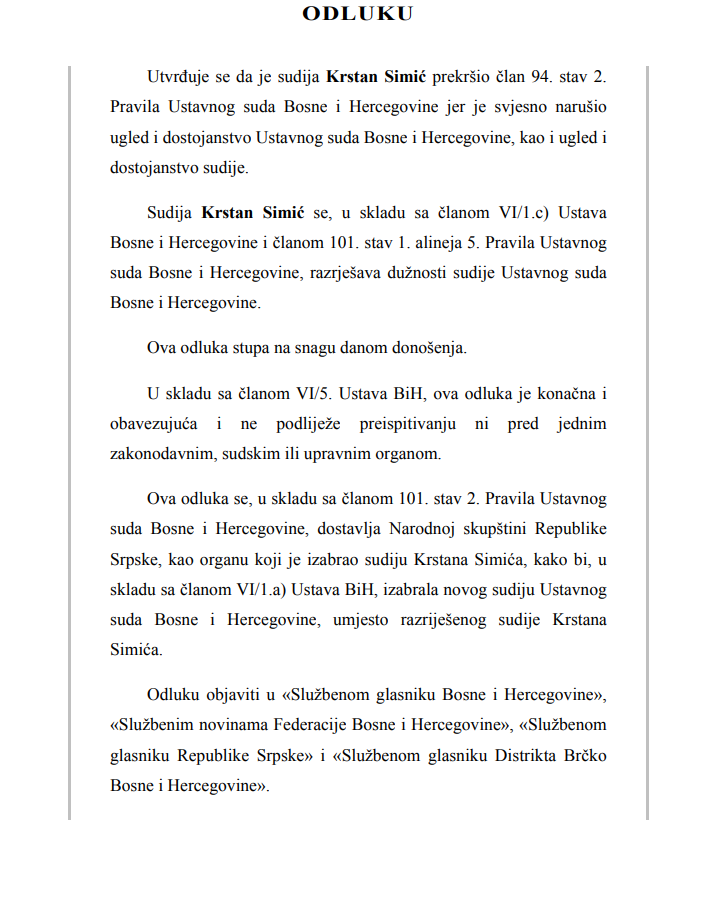 “Ustavni sud utvrđuje postojanje razloga iz stava (1) ovog člana, razrješava sudiju na osnovu konsenzusa ostalih sudija i o tome obavještava organ koji je izabrao tog sudiju”, stoji u članu 98. stav 2 Pravila Ustavnog suda BiH.