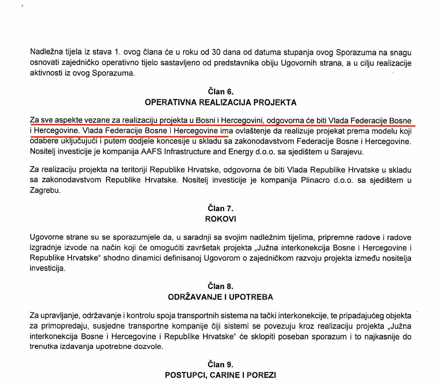 “Vlada Federacije Bosne i Hercegovine ima ovlaštenje da realizuje projekat prema modelu koji odabere, uključujući i putem dodjele koncesije u skladu sa zakonodavstvom Federacije Bosne i Hercegovine. Nositelj investicije je kompanija AAFS Infrastructure and Energy d.o.o. sa sjedištem u Sarajevu. Za realizaciju projekta na teritoriji Republike Hrvatske, odgovorna će biti Vlada Republike Hrvatske u skladu sa zakonodavstvom Republike Hrvatske. Nositelj investicije je kompanija Plinacro d.o.o. sa sjedištem u Zagrebu”, piše u “ažuriranom” nacrtu.