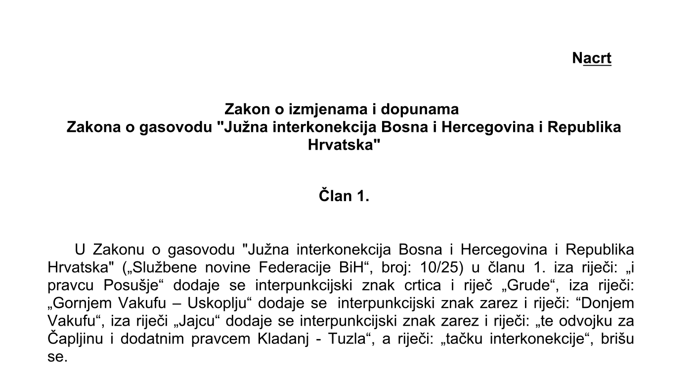 “Ovim Sporazumom se uređuju osnove saradnje i zajedničke izgradnje interkonekcije (svako sa svoje strane) na pravcu Zagvozd (Republika Hrvatska) – Posušje (Bosna i Hercegovina) – Tomislavgrad – Šuica – Kupres – Bugojno – Novi Travnik- Travnik i pravcu Posušje – Grude – Široki Brijeg – Mostar, sa odvojcima prema Livnu, Gornjem Vakufu-Uskoplju, Donjem Vakufu i Jajcu, te odvojku za čapljinu i dodatnim pravcem Kladanj–Tuzla u Bosni i Hercegovini i gasovoda Split – Zagvozd u Republici Hrvatskoj”, navedeno je u nacrtu Sporazuma kojeg je prošle sedmice utvrdila Vlada FBiH.
