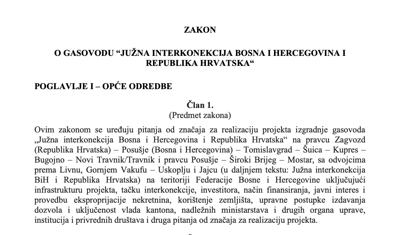 “Ovim zakonom se uređuju pitanja od značaja za realizaciju projekta izgradnje gasovoda „Južna interkonekcija Bosna i Hercegovina i Republika Hrvatska“ na pravcu Zagvozd (Republika Hrvatska) – Posušje (Bosna i Hercegovina) – Tomislavgrad – Šuica – Kupres – Bugojno – Novi Travnik/Travnik i pravcu Posušje – Široki Brijeg – Mostar, sa odvojcima prema Livnu, Gornjem Vakufu – Uskoplju i Jajcu (u daljnjem tekstu: Južna interkonekcija BiH i Republika Hrvatska) na teritoriji Federacije Bosne i Hercegovine uključujući infrastrukturu projekta, tačku interkonekcije, investitora, način finansiranja, javni interes i provedbu eksproprijacije nekretnina, korištenje zemljišta, upravne postupke izdavanja dozvola i uključenost vlada kantona, nadležnih ministarstava i drugih organa uprave, institucija i privrednih društava i druga pitanja od značaja za realizaciju projekta”.