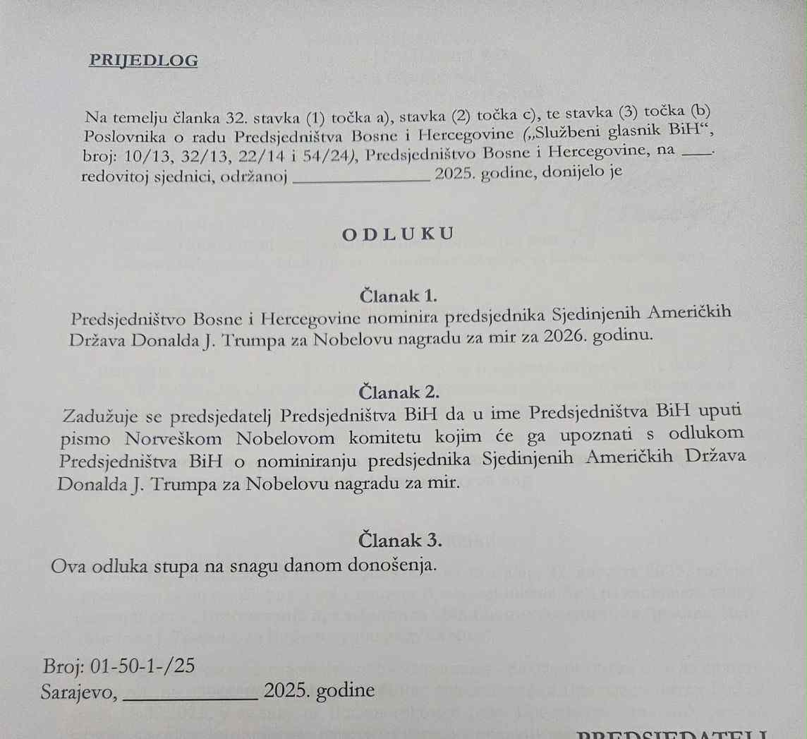“Zadužuje se predsjedavajući Predsjedništva BuH da u ime Predsjedništva BiH uputi pismo Norveškom Nobelovom komitetu kojim će ga upoznati s odlukom Predsjedništva BiH o nominiranju predsjednika Sjedinjenih Američkih Država Donalda J. trumpa za Nobelovu nagradu za mir”, stoji u odluci Predsjedništva BiH.