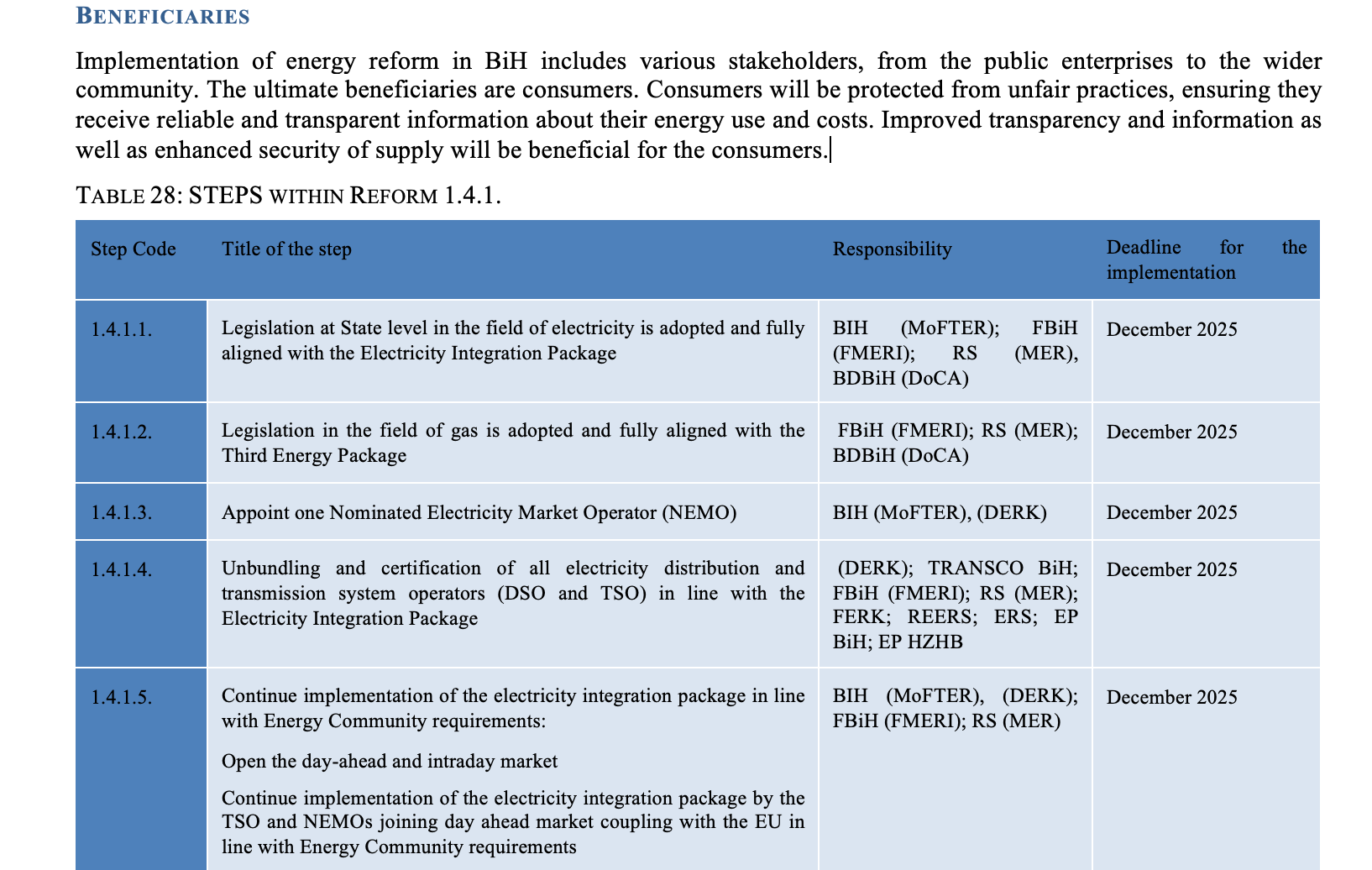 “Usvojiti i u potpunosti uskladiti zakonodavstvo u području prirodnog plina s Trećim energetskim paketom, putem dva entitetska zakona o plinu. Republika Srpska ima Zakon o plinu („Službeni glasnik Republike Srpske“, br. 22/18 i 15/21) koji je usklađen s Trećim energetskim paketom. Federacija BiH ima Nacrt zakona o plinu (veljača 2025.). Na taj način, transpozicija i provedba Trećeg energetskog paketa (tj. dodjeljivanje regulatornih ovlasti nadležnom tijelu, provedba obveza razdvajanja operatora prijenosnog sustava, usvajanje odgovarajućih mrežnih tarifa, otvaranje tržišta itd.) bit će postignuta i u dijelu BiH (FBiH), gdje to do sada nije bilo moguće zbog korištenja plinskog zakonodavstva koje nije usklađeno s pravnom stečevinom EU. Također, definirat će se uvjeti za rješavanje alokacije kapaciteta, razvoja transportne mreže, uravnoteženja, tržišta plina, uspostavljanja mrežnih pravila, certificiranja i razdvajanja operatora transportnog sustava i drugih pitanja za sektor prirodnog plina, uključujući i u Federaciji BiH, gdje to do sada nije bilo moguće, zbog korištenja plinskog zakonodavstva koje nije usklađeno s pravnom stečevinom EU”, navedeno je u u Poglavlju 1.4.1.2.