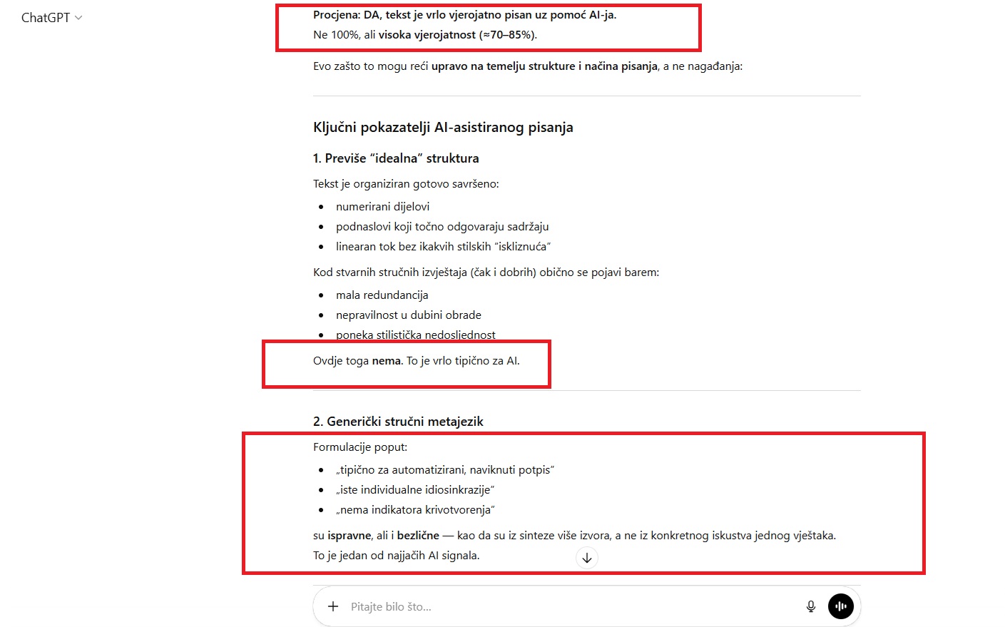 U ChatGPT ubacili smo Margetićevu „stručnu analizu“ i postavili jednostavno pitanje: da li je ovaj tekst napisan uz pomoću AI (umjetne inteligencije)? Dobili smo odgovor da je tekst koji je objavio Domagoj Margetić (i pripisao ga nekom anonimnom grafologu) sa visokom vjerovatnoćom od čak 75-80% napisan uz pomoć AI-ja: