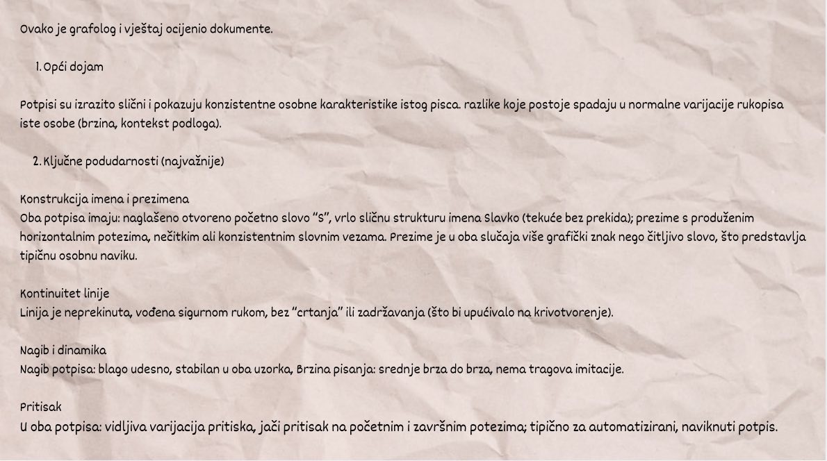 Dakle, sama činjenica da ne znamo ko stoji iza ove analize znači da je ne možemo prihvatiti kao vjerodostojnu. Mi nismo imali na raspolaganju stručnjake i sudske vještake, ali nas je tekst navodne analize neimenovanog grafologa i vještaka, skeptične kakvi jesmo, naveo da posumnjamo da je taj „grafolog“ i vještak možda bio sam Domagoj Margetić?! Pa smo to odlučili provjeriti.
