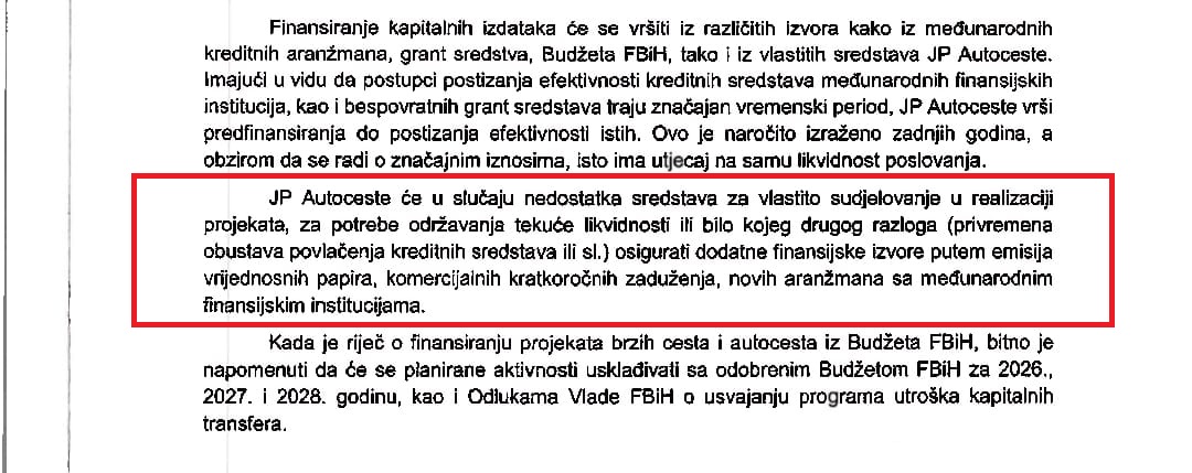 U samom uvodu trogodišnjeg plana poslovanja Autocesta navodi se da je jedan od ključnih zadataka preduzeća “nastaviti aktivnosti na osiguranju sredstava iz različitih izvora, međunarodnih kreditnih sredstava, grant sredstava, sredstava iz Budžeta Federacije BiH ili iz drugih izvora finansiranja”. Istovremeno, naglašava se i potreba da se “u saradnji sa Vladom FBiH osiguraju preduslovi za prevazilaženje problema sa likvidnošću poslovanja”. Drugim riječima, stabilnost budućeg poslovanja Autocesta direktno će zavisiti od novih izvora novca – kojih, kolikih i odakle tačno, ne zna se.