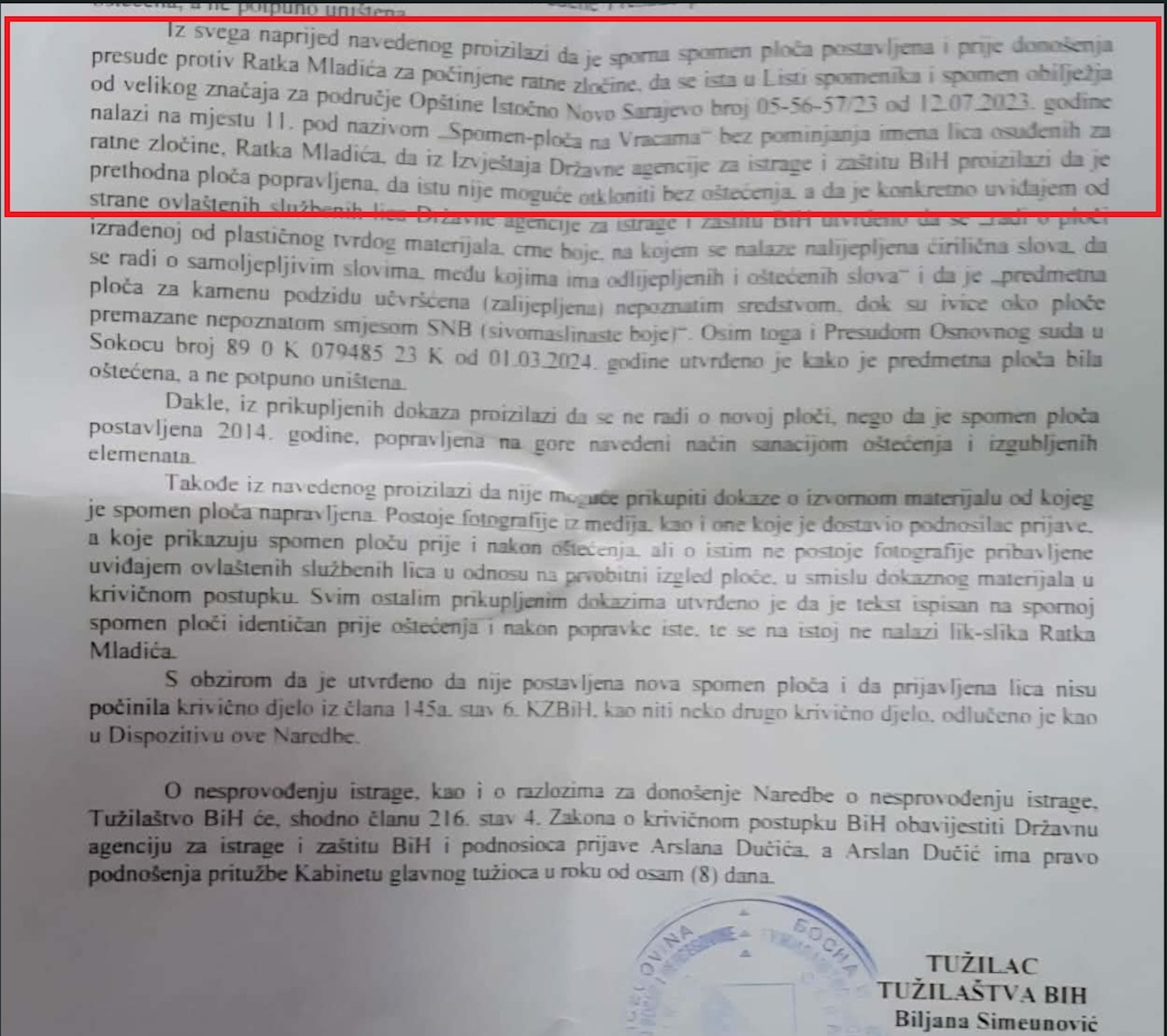 „S obzirom da je utvrđeno da nije postavljena nova spomen ploča i da prijavljena lica nisu počinila krivično djelo iz člana 145a. stav6. KZBiH, kao niti neko drugo krivično djelo, odlučeno je kao u Dispozitivu ove Naredbe“, stoji u Naredbi o nesprovođenju istrage koju je potpisala tužiteljica Biljana Simeunović.